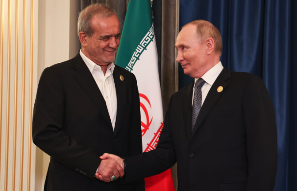 伊朗总统马苏德·佩泽什基扬和俄罗斯总统弗拉基米尔·普京去年在上海会晤。图源:塔斯社