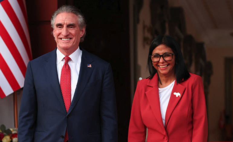 当地时间3月5日,美国国务院宣布,美国和委内瑞拉已同意恢复外交和领事关系。图为委内瑞拉临时总统德尔西·罗德里格斯(右)在委内瑞拉首都加拉加斯米拉弗洛雷斯总统府,在美国内政部长道格·伯古姆(左)的陪同下签署文件。图源:PBS