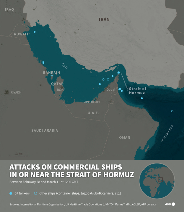 霍尔木兹海峡及其附近区域在2026年2月28日至3月11日发生的商船袭击事件分布(蓝色圆点:油轮;空心圆:其他船舶)。图源:AFP