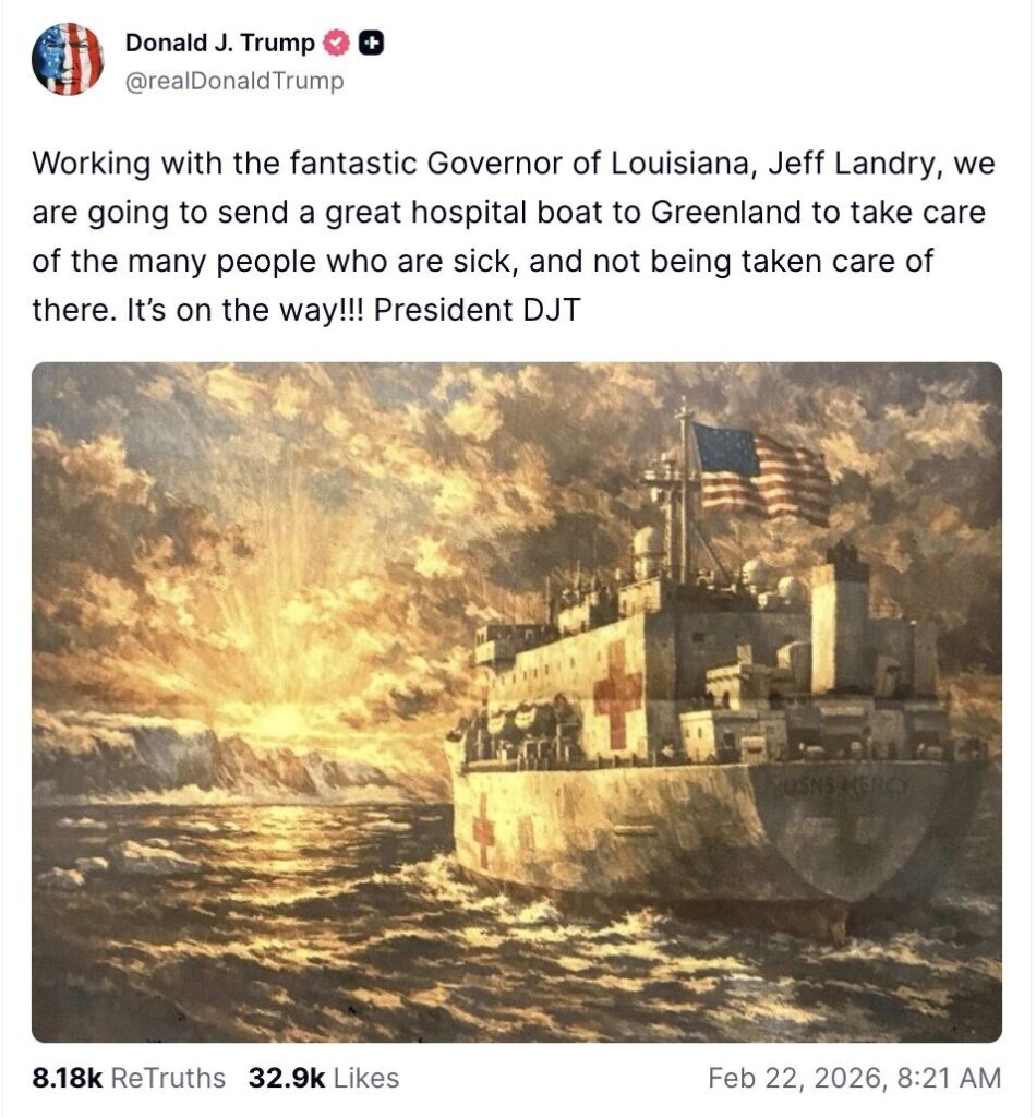 2月22日,特朗普在社交媒体发文称,他将派一艘满载医疗用品的船前往该岛,并声称岛上“许多人”生病了,“没有得到照顾”。图:Truth Social