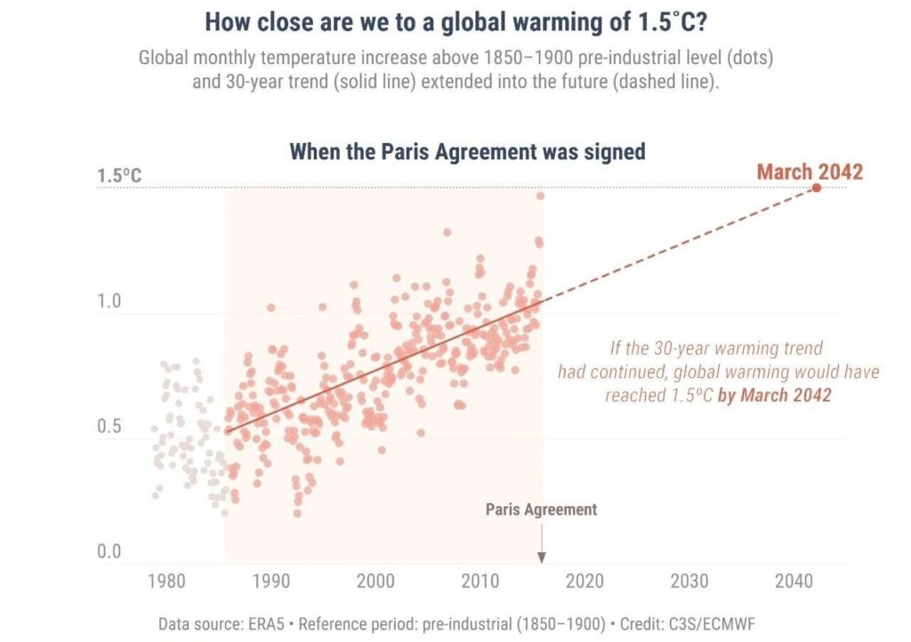 哥白尼气候观策计划的数据显示,2015年12月《巴黎协定》签署时,1.5°C的升温阈值将在2042年3月达到。2025年末在协定签署十周年之际,该计划预测,这一目标将在2029年5月达到。图片:哥白尼计划