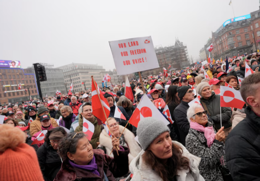 2025年3月15日,格陵兰民众在努克美国领事馆前举行抗议活动。图源:美联社