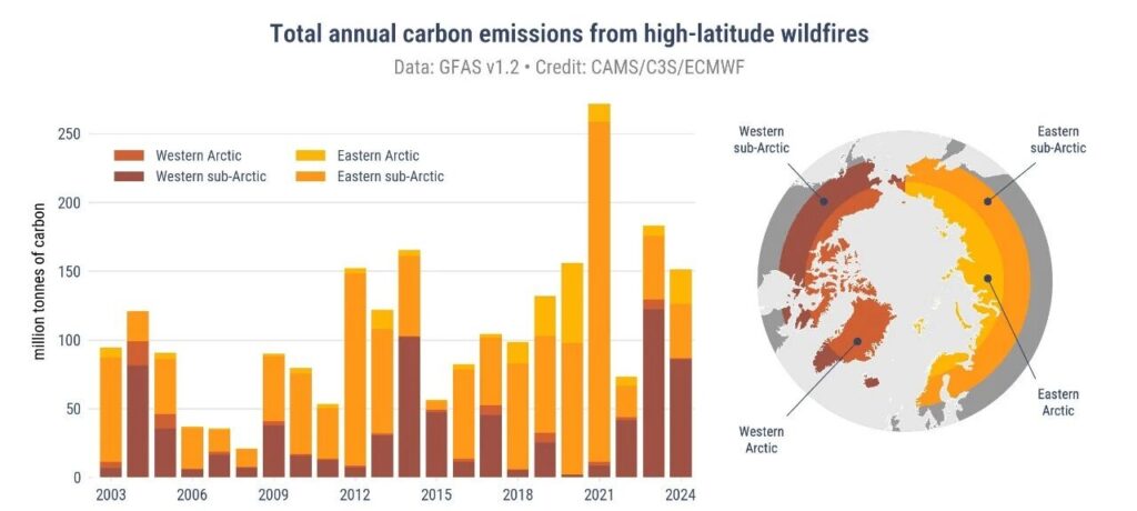 2003年至2024年北半球高纬度地区(北纬 60° 以北)所有陆地野火造成的年度碳排放总量估算值(百万吨)。颜色代表排放区域。(右图)地图显示了四个区域:西部亚北极(深棕色)、西部北极(浅棕色)、东部亚北极(深橙色)和东部北极(浅橙色)。图源:哥白尼计划